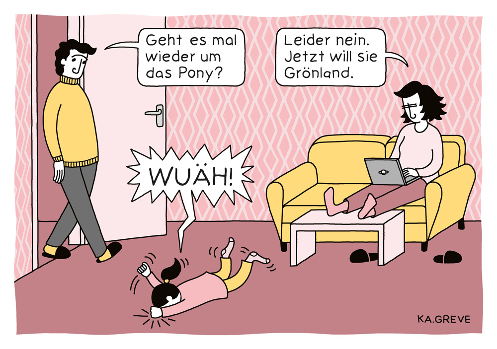 Begleitend zur großen Ausstellung »Witz² – Humor- und Witzzeichnungen von Erich Ohser präsentiert die Galerie e.o.plauen Arbeiten der Berliner Comickünstlerin und Autorin Katharina Greve (* 1972) – eine der prägnantesten satirischen Stimmen im deutschsprachigen Raum.